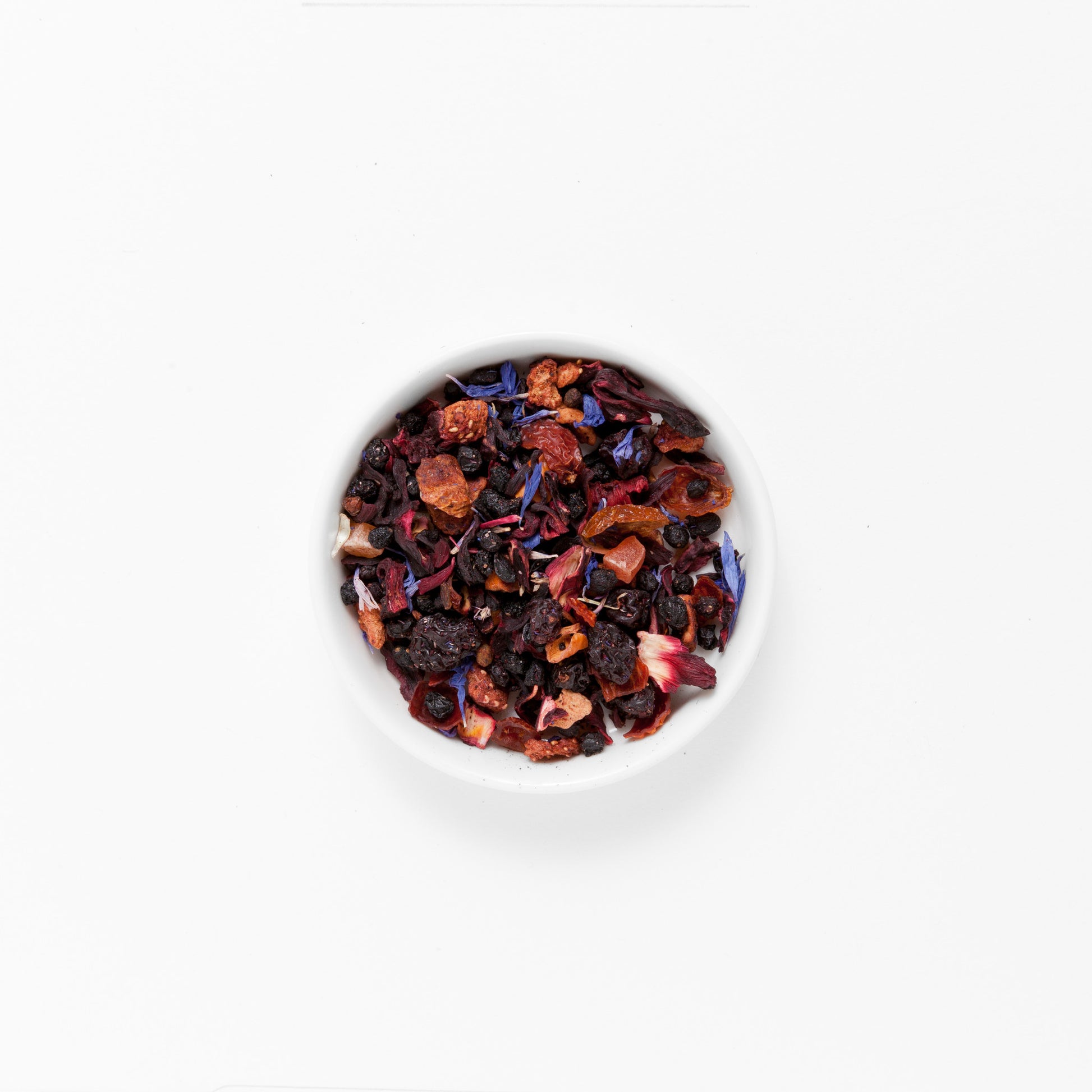 INGREDIENTS: elderberries, hibiscus blossoms, currants, papaya cubes (papaya, sugar), apple pieces, rose hip peel, flavoring, freeze-dried strawberry pieces, cornflower blossoms, blackcurrants, blueberries.